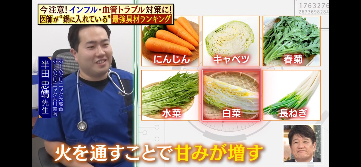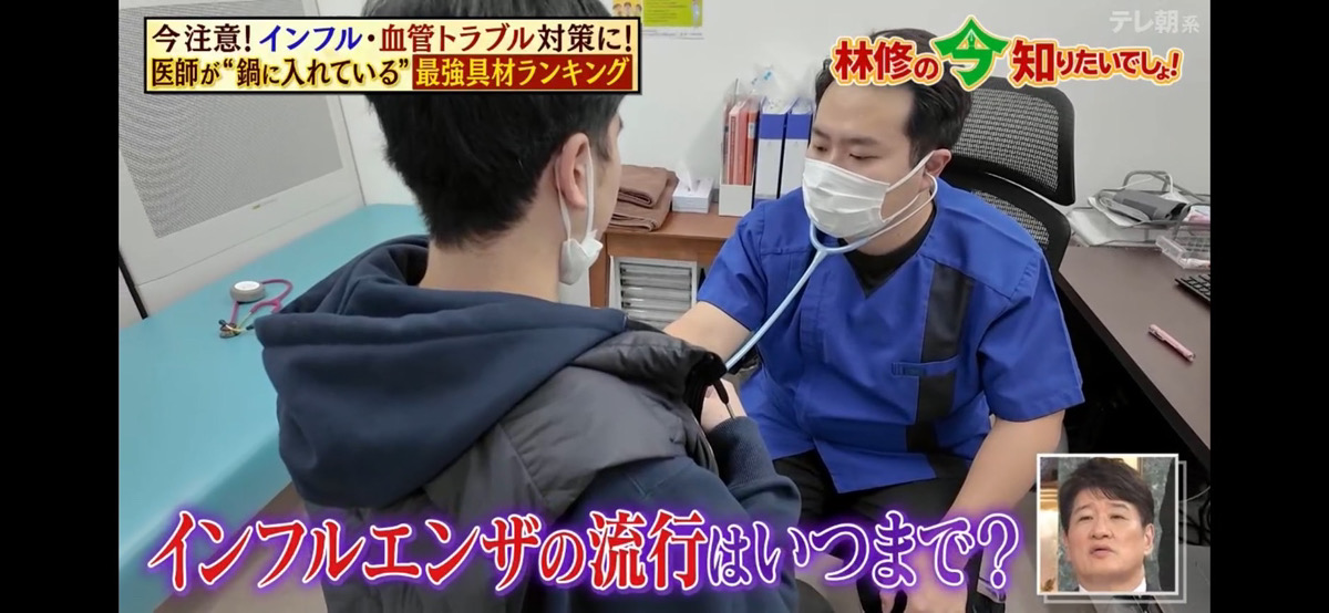 【メディア出演のお知らせ】12月4日放送のテレビ朝日「林修の今知りたいでしょ!」に出演しました 2025.12.12 メディア出演の報告 2025年12月4日(木)の『林修の今知りたいでしょ!医師が実際に入れていた 冬の体を守る鍋の最強具材を大発表SP』に、当院医師が出演いたしました。 番組内の「医師が鍋に入れている最強具材ランキング」コーナーにおいて、専門家の立場から解説を行いました。 今後も地域の皆さまの健康に役立つ情報を発信してまいります。 ホームクリニック吉川美南 Post Share Hatena Pocket RSS feedly Pin it 土曜日に不定期で整形外科の外来を開始いたします。 前の記事 ホームクリニック吉川美南 LINE公式アカウント開設のお知らせ 次の記事